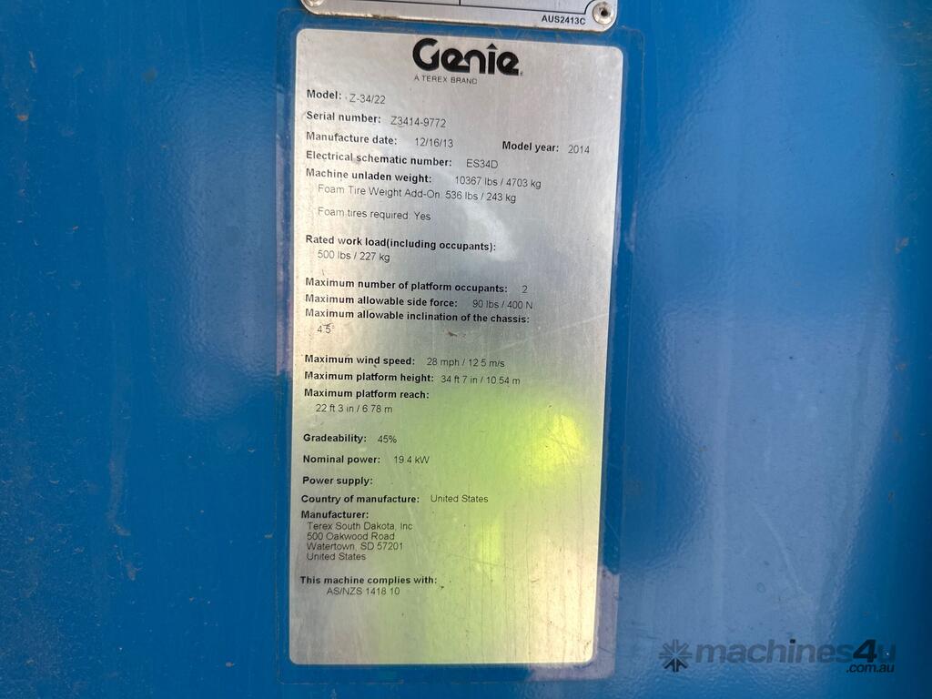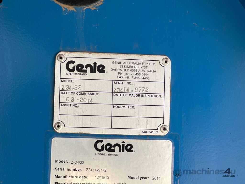 CP: CIRCA 2014,Genie,Z-34/22,Boom Lift,3 Cyl,Diesel,Odometer not visible,927 (Hrs. Showing on Hour meter),Colour: Blue,Unregistered,Serial No: Z3414-9772,Sold with No Plates