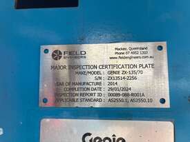 CP: CIRCA 2014,Genie,ZX-135/70,Boom Lift,4 Cyl,Diesel,Odometer not visible,2785 (Hrs. Showing on Hour meter),Colour: Blue,Unregistered,Serial No: ZX,Sold with No Plates