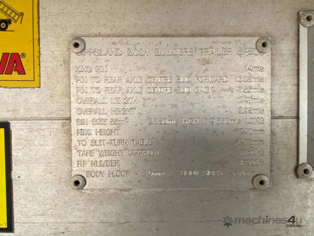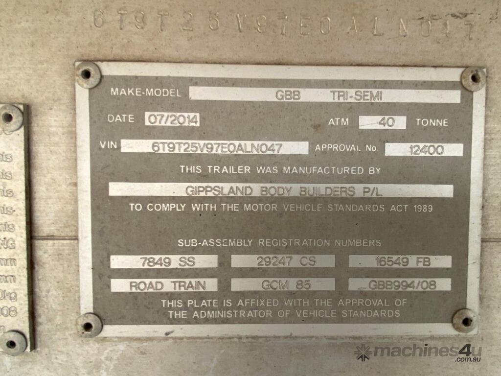 CP: 07/2014,Built: 07/2014,Gippsland Body Builders,Tri-semi,Tri Axle Aluminium Tipping A Trailer,Hubometer not visible,Colour: White,Rego. No: NP(YN22TF), Unregistered NAT,VIN: 6T9T25V97E0ALN047,Sold with No Plates