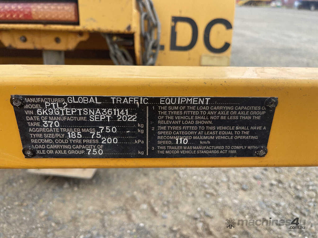 CP: 03/2014,Global Traffic Equipment,PLT2,Single Axle Traffic Light Trailer Combination,Hubometer not visible,Unregistered,VIN: 6K9GTEPTSNA361141,Sold with No Plates