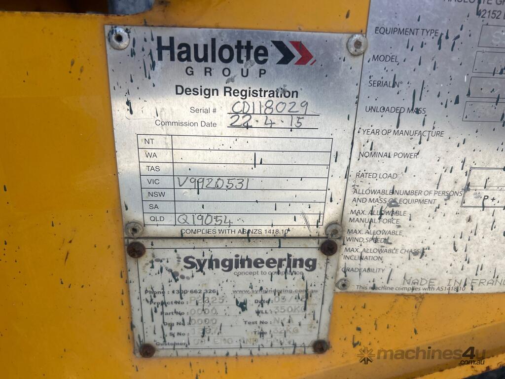 CP: CIRCA 2014,Haulotte,H15SX,Scissor Lift,Diesel,Odometer not visible,1572 (Hrs. Showing on Hour meter),Colour: Yellow,Unregistered,Serial No: CD118029,Sold with No Plates,Key No: 117