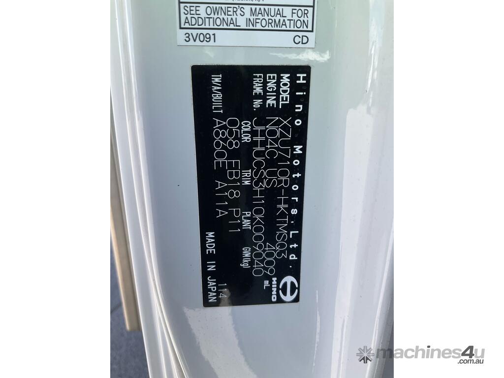 CP: 05/2014,Hino,300 616 ,Pantech,Automatic,Leaf Spring Suspension,Engine #: N04CUS16357,4 Cyl,Diesel,28914 (Kms. Showing on Odometer),Hourmeter not visible,Colour: White,Rego. No: NP(1QZ3MO), Unregistered VIC,VIN: JHHUCS3H10K009040,Key No: 73,GVM: 4495,GCM: 7300,Sold with No Plates,Key No: 73