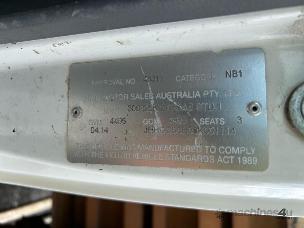 CP: 04/2014,Hino,300 616 ,Table Top,Manual,Spring,4 Cyl,Diesel,5 Gears,172972 (Kms. Showing on Odometer),Hourmeter not visible,Colour: White,Unregistered,VIN: JHHCCS3H30K001114,Key No: 244,GVM: 4495,GCM: 7995,Sold with No Plates,Key No: 244