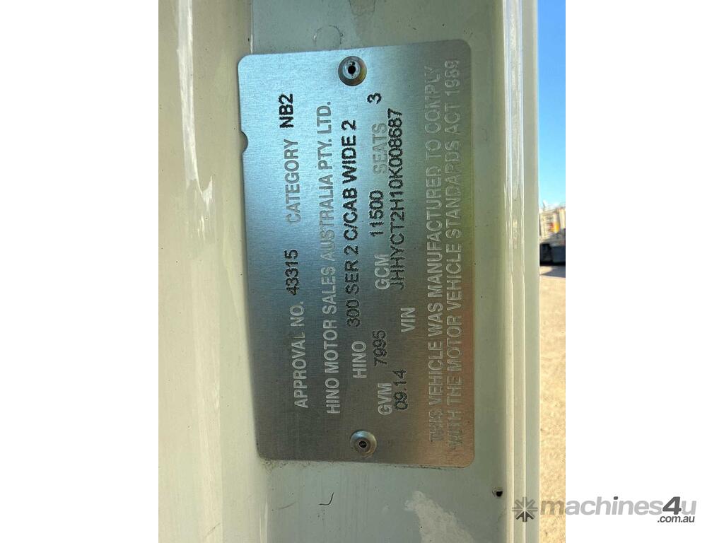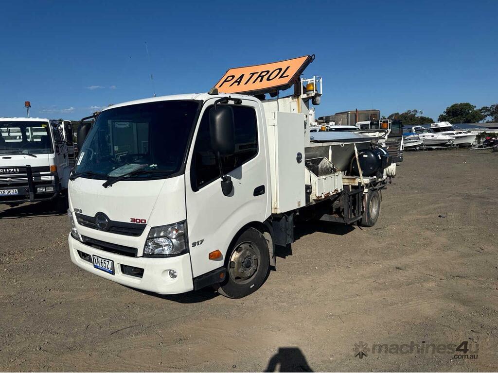 CP: 09/2014,Hino,300 917,Tar Patching Unit,Manual,Spring,4 Cyl,Diesel,Turbo,265193 (Kms. Showing on Odometer),Hourmeter not visible,Colour: White,Rego. No: XN65ZJ NAT,VIN: JHHYCT2H10K008687,Length: 6.8 m,GVM: 7995,GCM: 11500,Sold with No Plates