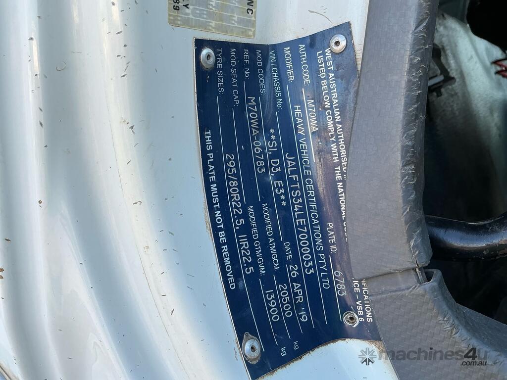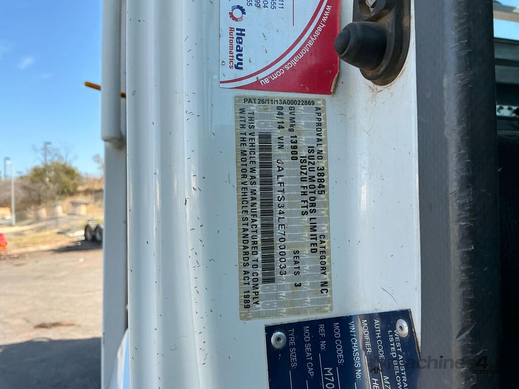 CP: 04/2014,Isuzu,FTS 800,Crane Truck (Table Top),Automatic,Spring,SiTec,6 Cyl,Diesel Turbo,436052 (Kms. Showing on Odometer),16573 (Hrs. Showing on Hour meter),Colour: White,Rego. No: 1GSP468 WA,Rego expiry: 15/01/2027,VIN: JALFTS34LE7000033,Key No: 147,Length: 8 m,GVM: 13900,GCM: 20500,Plates to All,Key No: 147