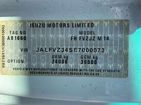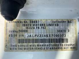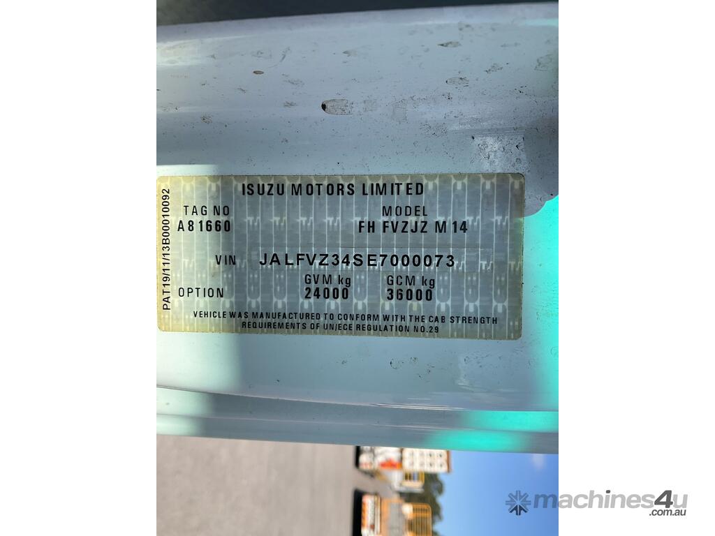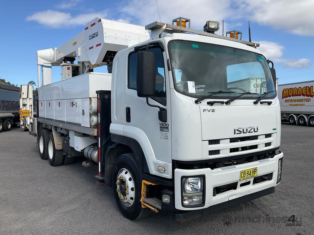 CP: 03/2014,Isuzu,FVZ 1400,EWP,Automatic,Spring ,Engine #: 6HK1657574,6 Cyl,Diesel Turbo,131489 (Kms. Showing on Odometer),7057 (Hrs. Showing on Hour meter),Colour: White,Rego. No: CB94HP NSW,Rego expiry: 30/11/2025,VIN: JALFVZ34SE7000073,Key No: 259E,Length: 9.9 m,GVM: 24000,GCM: 36000,Sold with No Plates,Key No: 259E