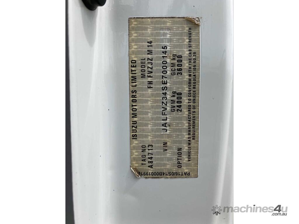 CP: 09/2014,Isuzu,FVZ1400 LWB,Tilt Tray,Automatic,Sitec SIII,Diesel,Turbo,210654 (Kms. Showing on Odometer),14935 (Hrs. Showing on Hour meter),Colour: White,Rego. No: XO81ZA NAT,VIN: JALFVZ34SE7000145,Length: 9.9 m,GVM: 24000,GCM: 36000,Sold with No Plates