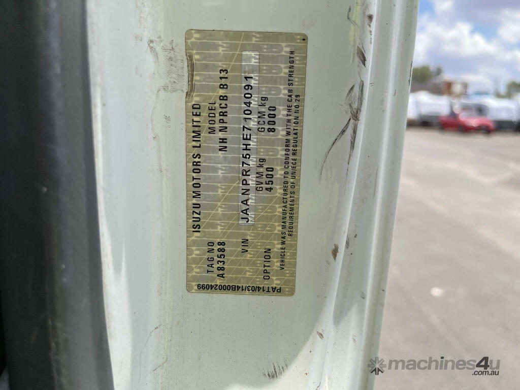 CP: 07/2014,Isuzu,NPR 200 MWB,Table Top,Manual,Spring,4HK1,4 Cyl,Diesel Turbo,6 Gears,454170 (Kms. Showing on Odometer),Hourmeter not visible,Colour: White,Rego. No: BZ94VE NSW,Rego expiry: 23/07/2026,VIN: JAANPR75HE7104091,Length: 7.5 m,GVM: 4500,GCM: 8000,Sold with No Plates