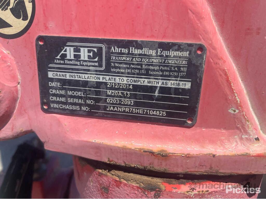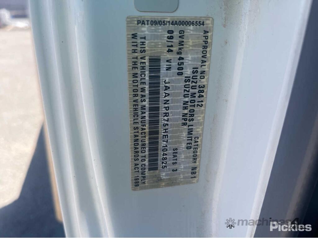 CP: 09/2014,Built: 09/2014,Isuzu,NPR 200 MWB,Table Top,Automatic,Spring ,Engine #: 4HK!273514,Isuzu 4HK1,5190 CC,4 Cyl,Diesel Turbo,54025 (Kms. Showing on Odometer),Hourmeter not visible,Colour: White,Rego. No: NP(S593BDZ), Unregistered SA,VIN: JAANPR75HE7104825,Key No: P85,Length: 5985 m,GVM: 4500,GCM: 8000,Sold with No Plates,Key No: P85