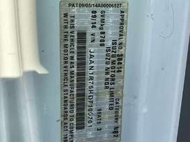 CP: 09/2014,Isuzu,NQR,Refrigerated Pantech,Manual,Leaf Spring Suspension ,4 Cyl,Diesel Turbo,6 Gears,371125 (Kms. Showing on Odometer),Hourmeter not visible,Colour: White,Rego. No: NP(A71304), Unregistered WA,VIN: JAAN1R75HD7100701,Key No: 104,GVM: 8700,GCM: 12200,Sold with No Plates,Key No: 104