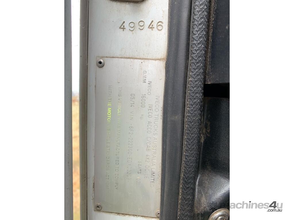 CP: 05/2014,Iveco,ACCO 2350,Cab Chassis,Automatic,Airbag Suspension,Cummins,Odometer not visible,Hourmeter not visible,Unregistered,VIN: 6F2222300EDX00209,GVM: 16000,GCM: 20500,Sold with No Plates,WOVR Status: WOVR N/A,Incident Type: Not Applicable