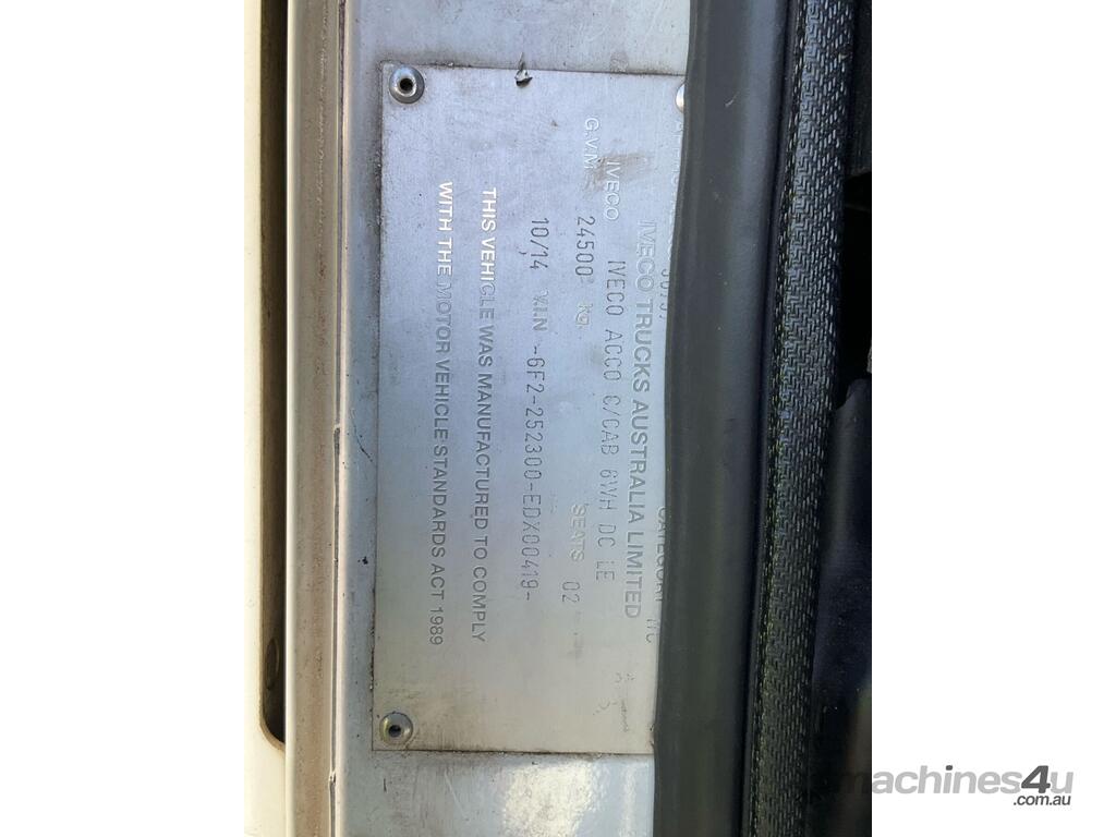 CP: 10/2014,Iveco,ACCO 2350,Garbage Compactor (Side Load),Automatic,Airbags ,Engine #: 22136052,Cummins ISL,6 Cyl,Diesel Turbo,198722 (Kms. Showing on Odometer),13061 (Hrs. Showing on Hour meter),Colour: White,Unregistered,VIN: 6F2252300EDX00419,Key No: 140E,Length: 9.4 m,GVM: 24500,GCM: 30000,Sold with No Plates,Key No: 140E