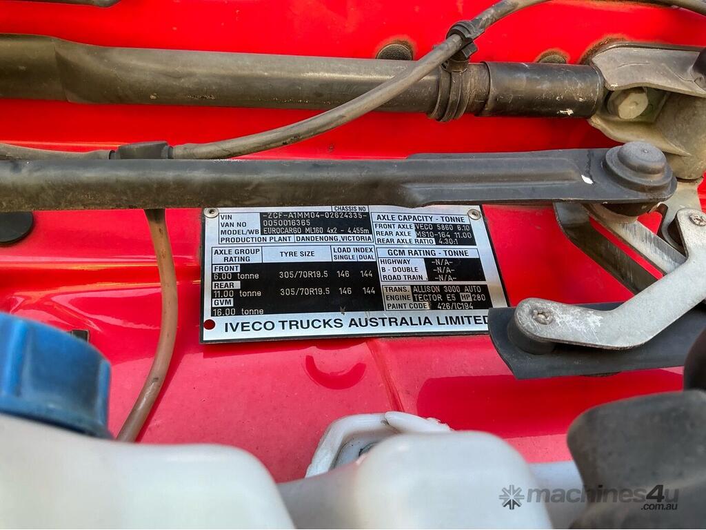 CP: 06/2014,Iveco,Eurocargo ML160 E28,Curtainsider,Automatic & Manual Mode,Air,6 Cyl,Diesel Turbo,201038 (Kms. Showing on Odometer),8404 (Hrs. Showing on Hour meter),Colour: Red,Rego. No: NP(1EOY486), Unregistered WA,VIN: ZCFA1MM,Key No: 595,Length: 7.7 m,GVM: 16000,GCM: 19500,Sold with No Plates,Key No: 595