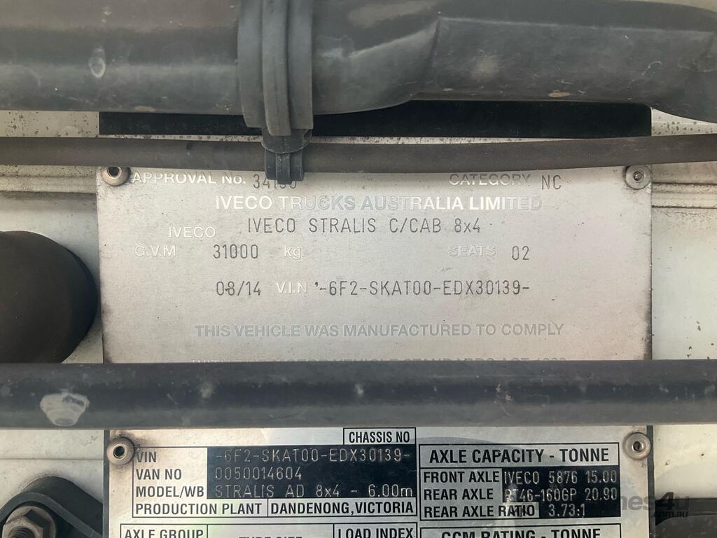 CP: 08/2014,Iveco,Stralis 450 EEV,Crane Tipper,Automatic,Airbag,Engine #: 219932,6 Cyl,Diesel Turbo,259967 (Kms. Showing on Odometer),Colour: White,Rego. No: CH67JW NSW,Rego expiry: 27/04/2025,VIN: 6F2SKAT00EDX30139,Key No: 244,Length: 18 ft,GVM: 31000,GCM: 75000,Plates to All,Key No: 244
