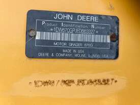 CP: CIRCA 2014,John Deere,670 GP,Articulated Motor Grader,Engine #: RG6090L121099,6 Cyl,Diesel,Turbo,Odometer not visible,6864 (Hrs. Showing on Hour meter),Colour: Yellow,Unregistered,VIN: 1DW670GPJED663327,Sold with No Plates