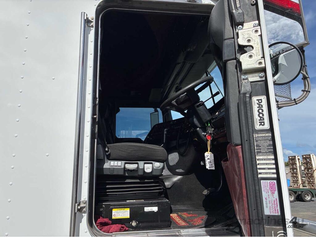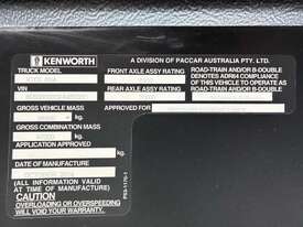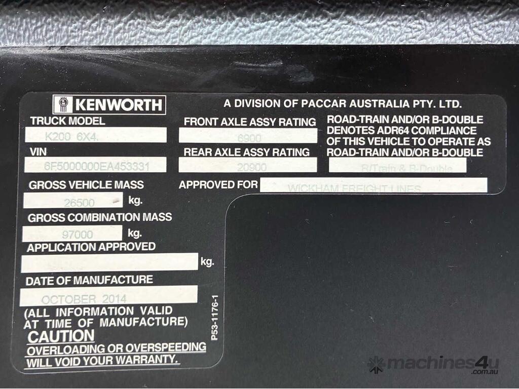 CP: 10/2014,Kenworth,K200 Big Cab,Prime Mover Sleeper Cab,Manual,Airbag,Engine #: 80241558,Cummins X15,6 Cyl,Diesel,18 Gears,183138 (Kms. Showing on Odometer),31172 (Hrs. Showing on Hour meter),Colour: White,Unregistered,VIN: 6F5000000EA453331,Key No: 109,Length: 6400 undefined,GVM: 26500,GCM: 97000,Sold with No Plates,Key No: 109