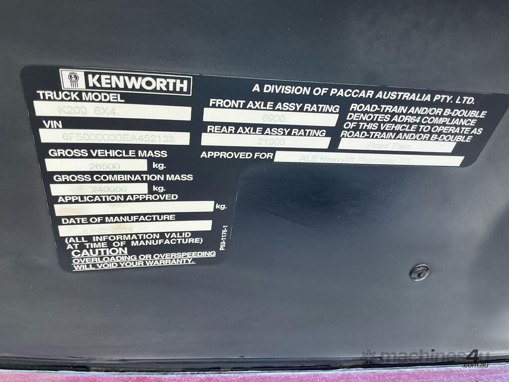 CP: 06/2014,Kenworth,K200 Series,Prime Mover,Manual,Leafspring,Cummins ISX,6 Cyl,Diesel Turbo,417170 (Kms. Showing on Odometer),13728 (Hrs. Showing on Hour meter),Colour: Red,Rego. No: 1IJG166 WA,Rego expiry: 25/09/2026,VIN: 6F5000000EA452133,Length: 7.2 m,GVM: 26500,GCM: 240000,Plates to All