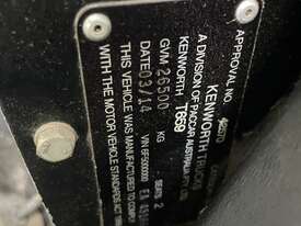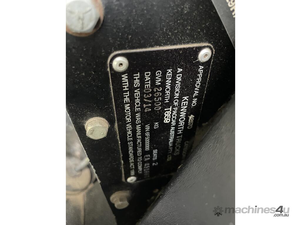 CP: 03/2014,Kenworth,T659,Prime Mover Sleeper Cab,Manual,Air Suspension ,6 Cyl,Diesel,18 Gears,897414 (Kms. Showing on Odometer),2414 (Hrs. Showing on Hour meter),Colour: White,Unregistered QLD,VIN: 6F5000000EA451667,GVM: 26500,Sold with No Plates