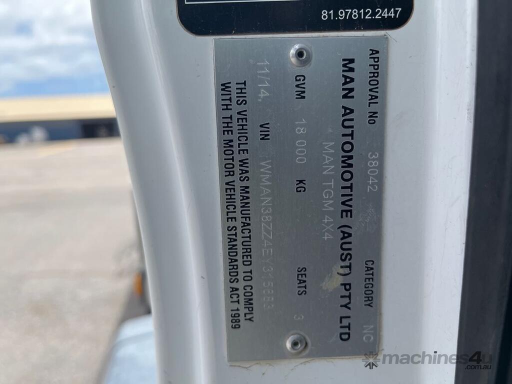 CP: 11/2014,MAN,TGM 18.340,EWP,Automatic,Leaf Spring,6 Cyl,Diesel Turbo,308832 (Kms. Showing on Odometer),10927 (Hrs. Showing on Hour meter),Colour: White,Rego. No: SB19JM SA,VIN: WMAN38ZZ4EY315683,Key No: P85,Length: 9.3 m,GVM: 18000,GCM: 33000,Sold with No Plates,Key No: P85