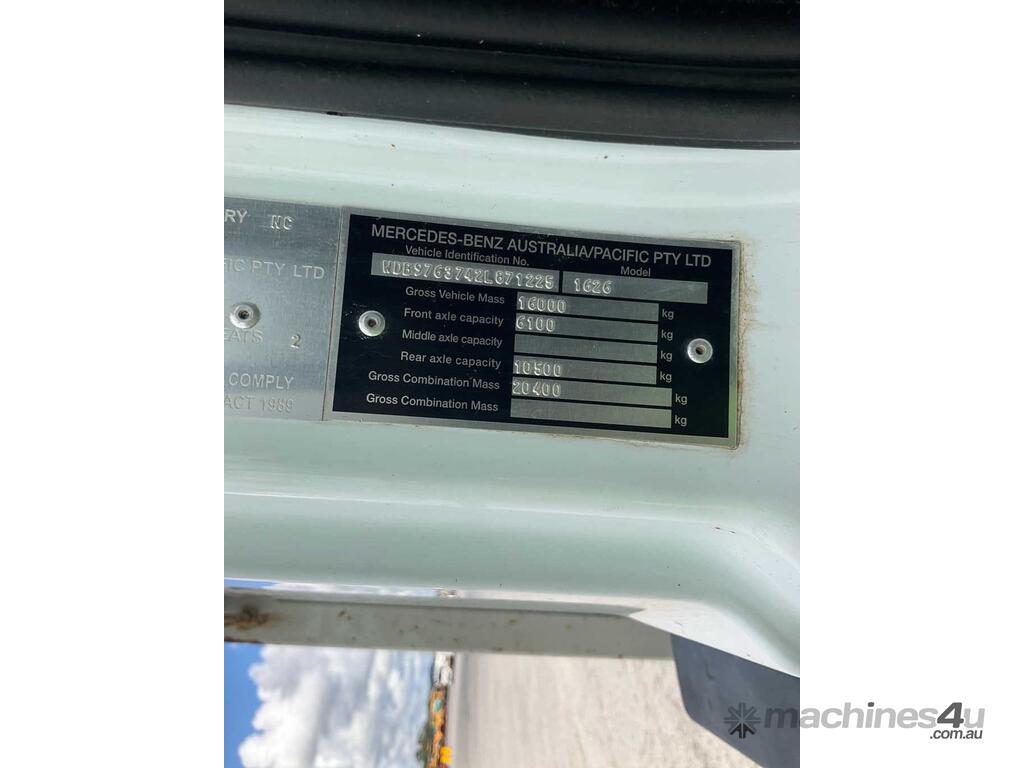 CP: 09/2014,Mercedes Benz,Atego 1626,Table Top Beaver Tail,Manual,Spring,Engine #: 902917C1073290,6 Cyl,Diesel Turbo,6 Gears,130424 (Kms. Showing on Odometer),2542 (Hrs. Showing on Hour meter),Rego. No: XV24YW VIC,Rego expiry: 30/03/2026,VIN: WDB9763742L871225,Key No: 562S,Length: 7.7 m,GVM: 16000,GCM: 20400,Sold with No Plates,Key No: 562S
