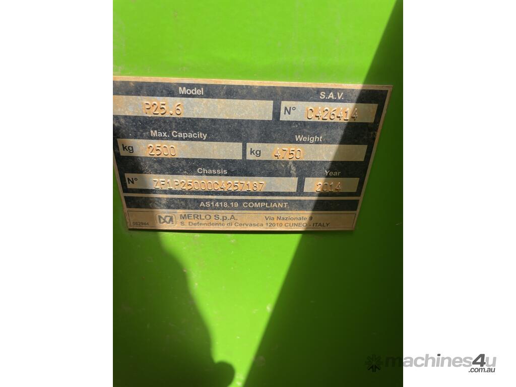 CP: CIRCA 2014,Merlo,P25.6,Telehandler,4 Cyl,Diesel,Odometer not visible,Hourmeter not visible,Colour: Green,Rego. No: NP(45858), Unregistered,Serial No: ZF1P25000C4257187,Sold with No Plates