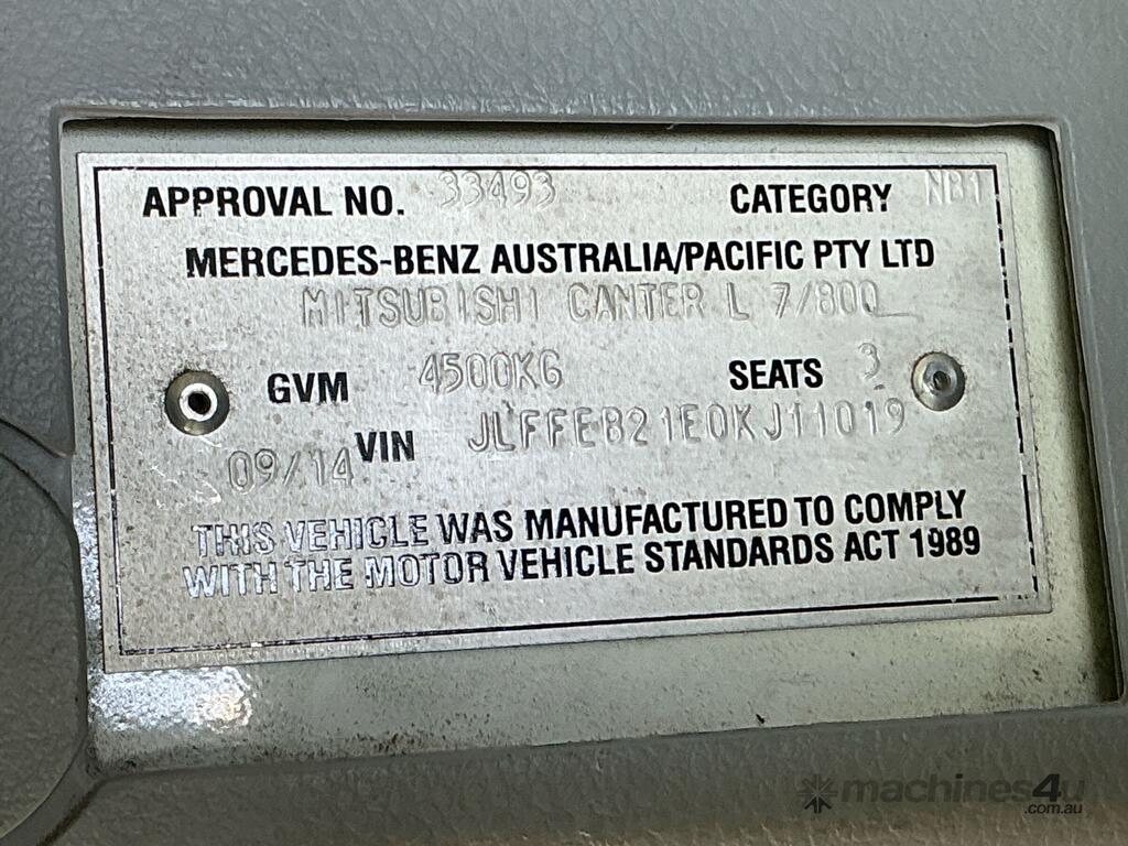 CP: 09/2014,Mitsubishi Fuso,Canter L7/800,Table Top,Manual,4 Cyl,Diesel Turbo,5 Gears,196125 (Kms. Showing on Odometer),Hourmeter not visible,Colour: White,Rego. No: NP(1EXD536), Unregistered WA,VIN: JLFFEB21E0KJ11019,GVM: 4500,GCM: 8000,Sold with No Plates,WOVR Status: WOVR N/A,Incident Type: Impact