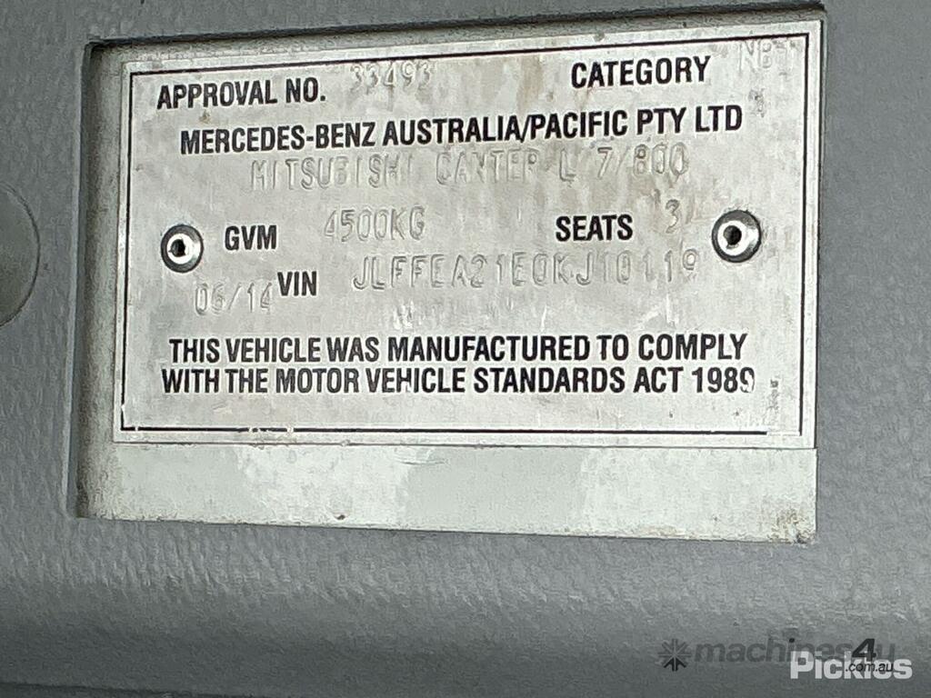CP: 06/2014,Mitsubishi Fuso,Canter,Table Top,Automatic,Spring ,4 Cyl,Diesel,Turbo,256333 (Kms. Showing on Odometer),Hourmeter not visible,Colour: White,Rego. No: NP(CK74XV), Unregistered NSW,VIN: JLFFEA21E0KJ10119,Length: 14 ft,GVM: 4500,GCM: 8000,Sold with No Plates