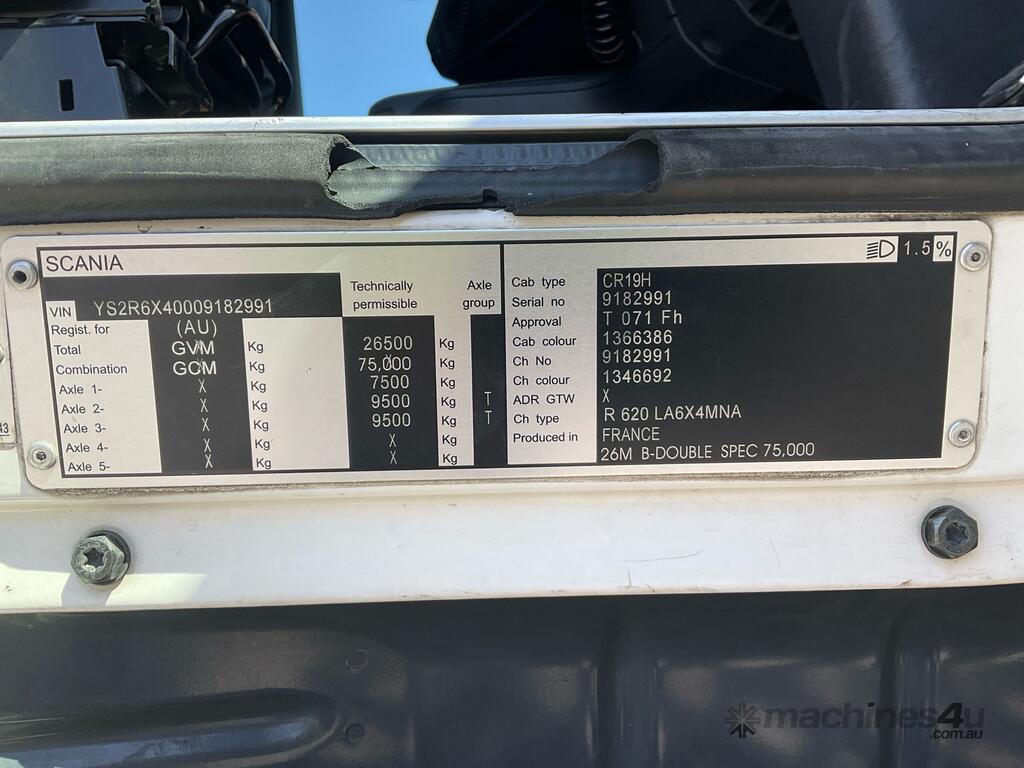 CP: 03/2014,Scania,R620,Prime Mover Sleeper Cab,Automatic,Airbags ,Euro 5,8 Cyl,Diesel Turbo,1443889 (Kms. Showing on Odometer),21087 (Hrs. Showing on Hour meter),Colour: White,Rego. No: NP(XQ16CX), Unregistered NSW,VIN: YS2R6X1,Key No: 404E,Length: 7 m,GVM: 26500,GCM: 75000,Sold with No Plates,Key No: 404E