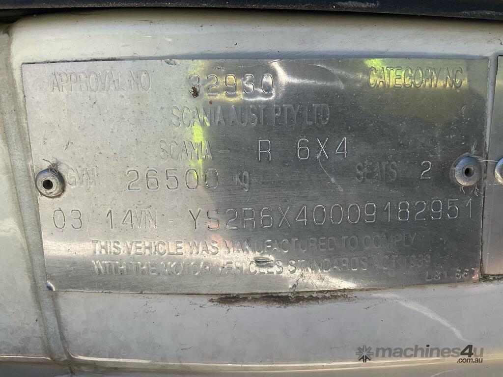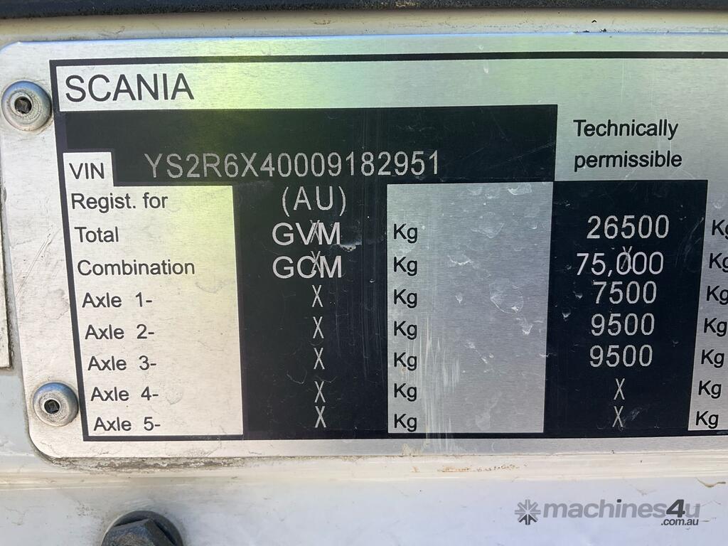 CP: 03/2014,Scania,R620,Prime Mover Sleeper Cab,Automatic,Airbags ,Euro 5,8 Cyl,Diesel Turbo,2150252 (Kms. Showing on Odometer),12660 (Hrs. Showing on Hour meter),Colour: White,Rego. No: XP94AH NAT,Rego expiry: 03/06/2026,VIN: YS2R6X1,Key No: 355E,Length: 7.1 undefined,GVM: 26500,GCM: 75000,Plates to All,Key No: 355E