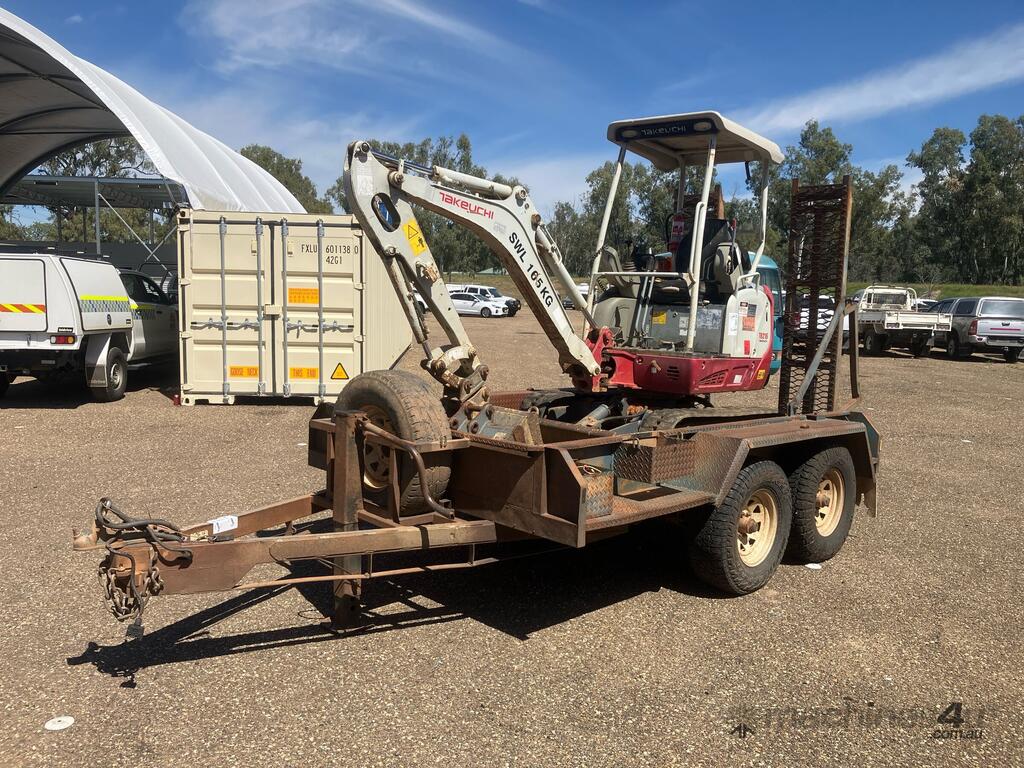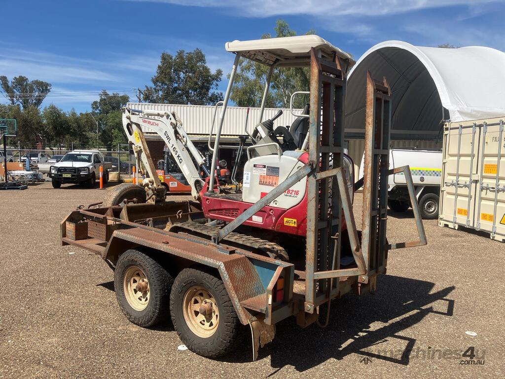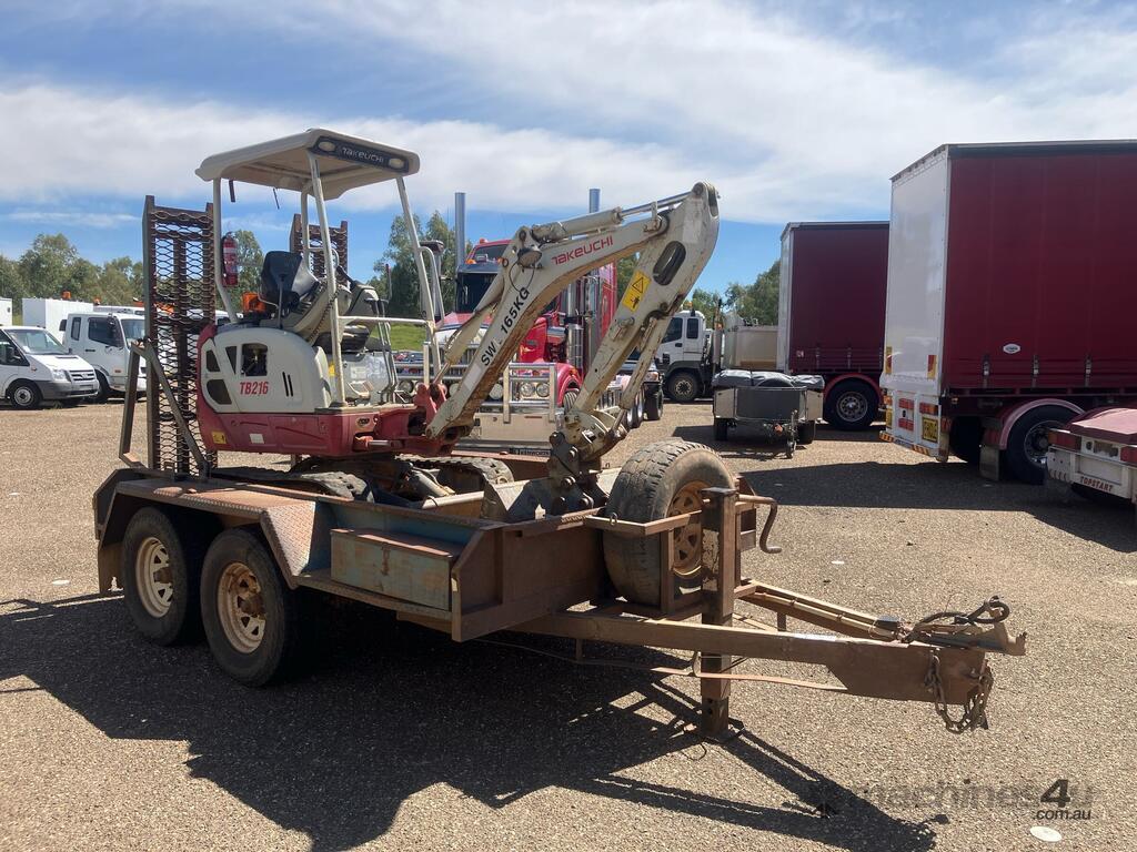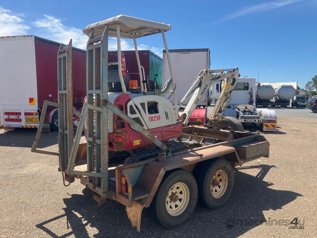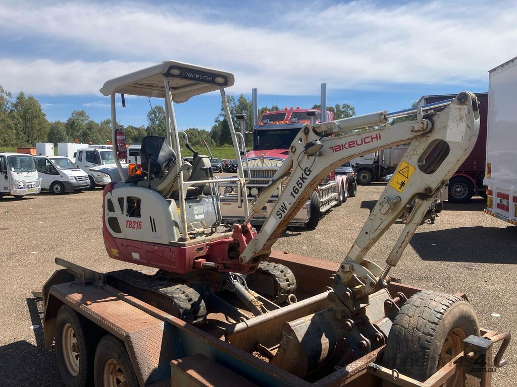 CP: CIRCA 2014,Takeuchi,TB216,Compact Excavator & Trailer Package,Engine #: B9419,3 Cyl,Diesel,Odometer not visible,1047 (Hrs. Showing on Hour meter),Colour: Grey,Unregistered,Serial No: ,ROPS No: undefined,Sold with No Plates