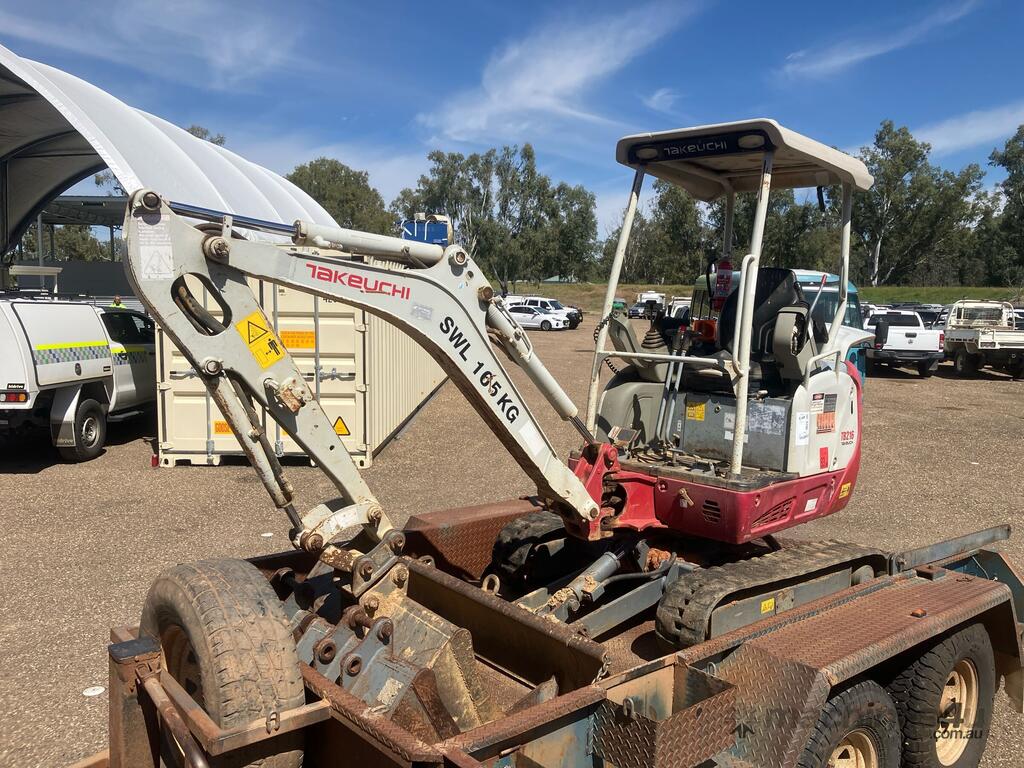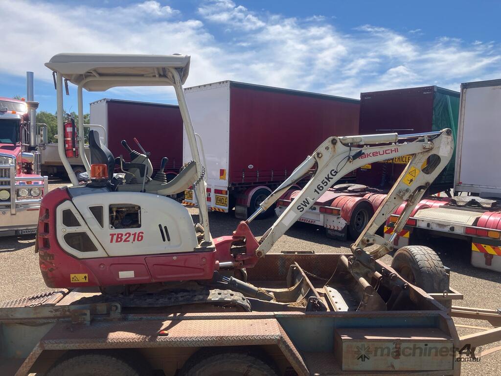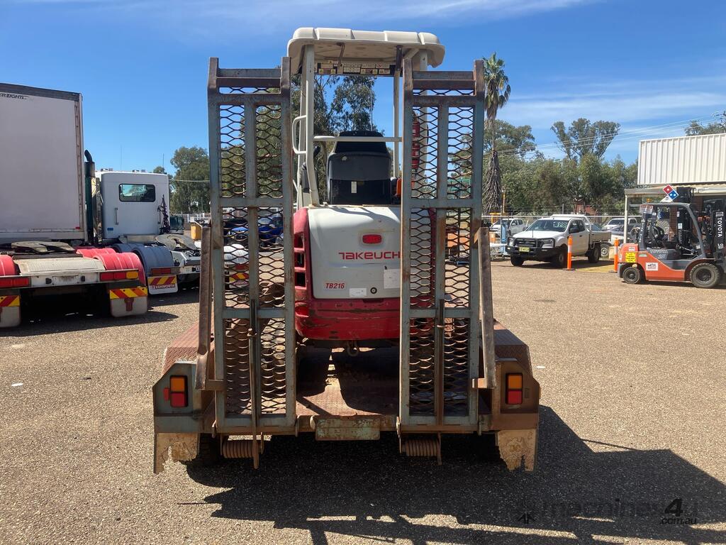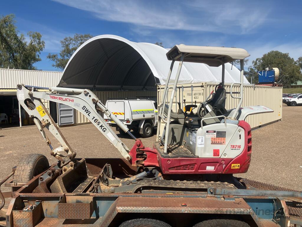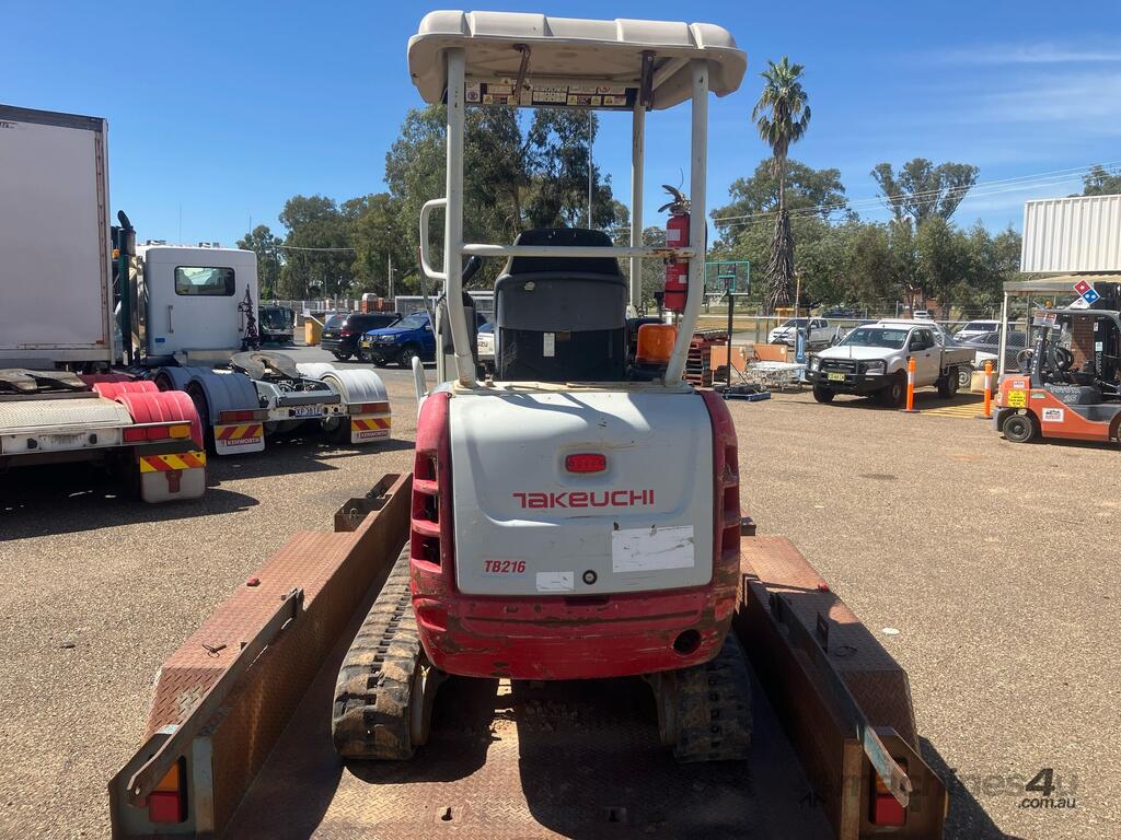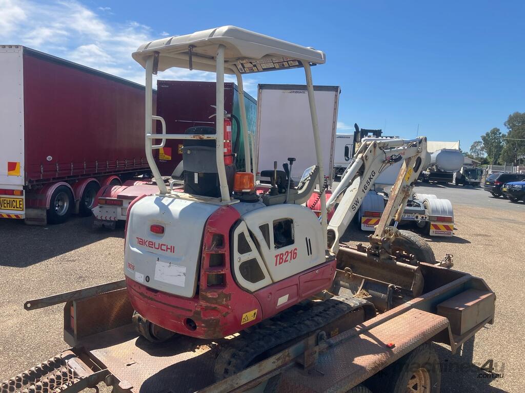 CP: CIRCA 2014,Takeuchi,TB216,Compact Excavator & Trailer Package,Engine #: B9419,3 Cyl,Diesel,Odometer not visible,1047 (Hrs. Showing on Hour meter),Colour: Grey,Unregistered,Serial No: ,ROPS No: undefined,Sold with No Plates