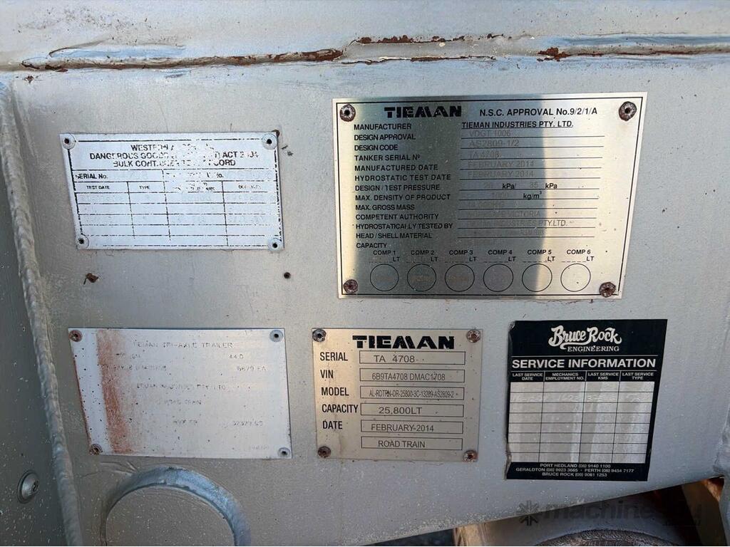 CP: 02/2014,Tieman,Tri Axle Fuel Tanker A Trailer,465634 (Kms. Showing on Hubometer),Colour: Green,Rego. No: 1TOZ445 WA,VIN: 6B9TA4708DMAC1708,Sold with No Plates