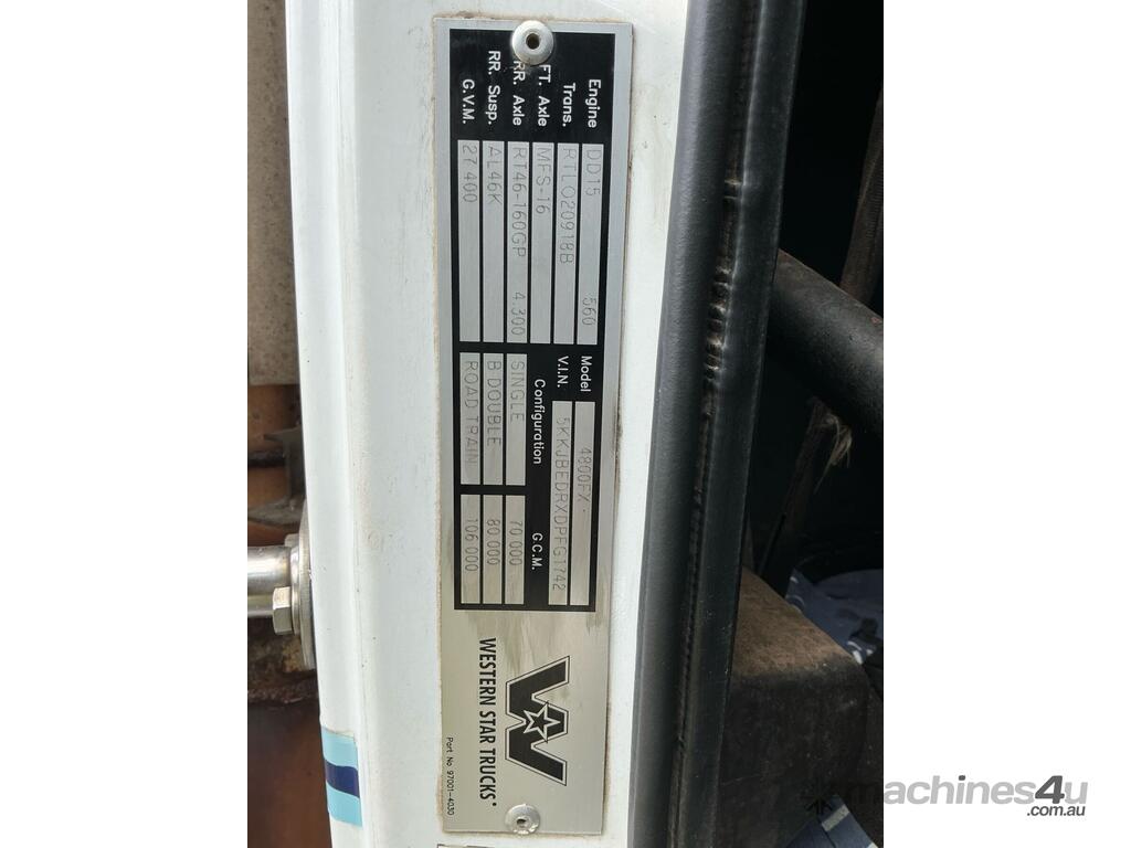 CP: 02/2014,Western Star,4800FX,Prime Mover Sleeper Cab,Manual,Air Bag ,Detroit ,6 Cyl,Diesel,18 Gears,175418 (Kms. Showing on Odometer),Hourmeter not visible,Colour: White,Unregistered,VIN: 5KKJBEDRXDPFG1742,Length: 7.6 m,GVM: 27400,GCM: 106000,Sold with No Plates,WOVR Status: WOVR N/A,Incident Type: Water