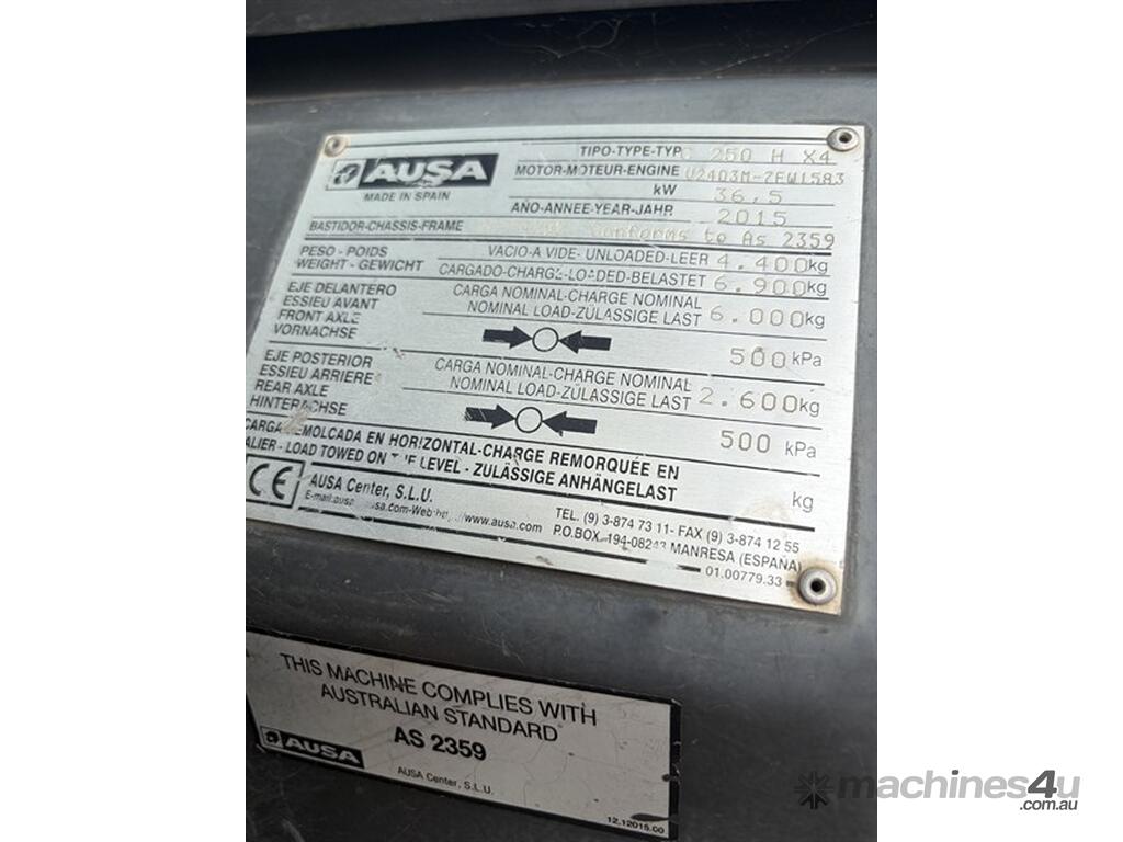 2015 AUSA C 250H. Registered until 02.01.27, Kubota motor, diesel, 2500kg to 500mm load centre, 49hp. Located at Moree NSW.