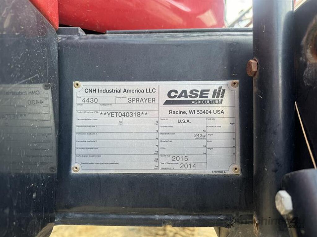 2015 CASE IH Patriot 4430 Sprayer SPRAYER - 9,700 hours RTK guidance, 4500 litre spray tank, 36 metre boom, conventional spray system. Chassis No YET040318. Located Moree, NSW. Contact Sandy Bailey for more information.