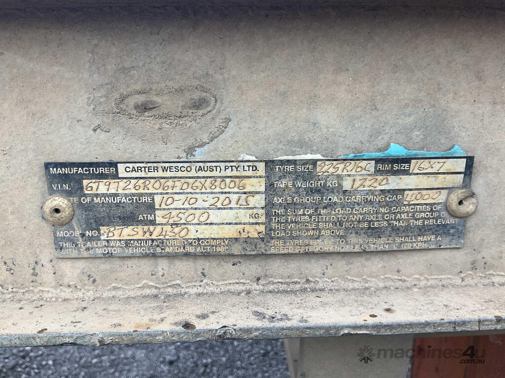 CP: 10/2015,Built: 10/2015,Carter Wesco,BTSW450,Tandem Axle Plant Trailer,Hubometer not visible,Colour: Galvanised,Rego. No: TA38WZ NSW,Rego expiry: 20/10/2026,VIN: 6T9T26R06F06X8006,Serial No: NULL,Sold with No Plates