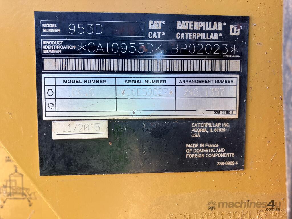 CP: CIRCA 2015,Caterpillar,953D,Track Loader,Engine #: C6E59027,6 Cyl,Diesel,Odometer not visible,2607 (Hrs. Showing on Hour meter),Colour: Yellow,Rego. No: NP(78161D), Unregistered,VIN: CAT0953DKLBP02023,ROPS No: undefined,FOPS No: undefined,Sold with No Plates,Key No: 27