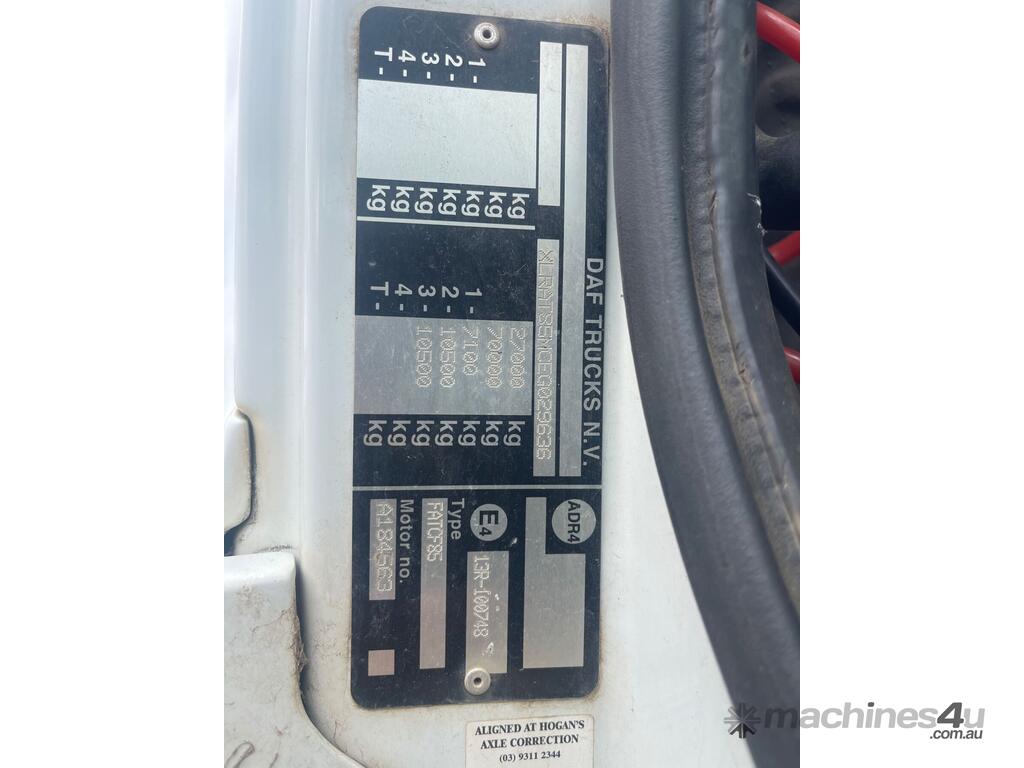 CP: 03/2015,DAF,CF 85 460,Table Top,Automatic,Airbag,Engine #: A184563,Paccar,6 Cyl,Diesel,268548 (Kms. Showing on Odometer),Hourmeter not visible,Colour: White,Rego. No: NP(XB60GM), Unregistered NAT,VIN: XLRAT85MCEG029636,Key No: T13,Length: 11 m,GVM: 27000,GCM: 70000,Sold with No Plates,Key No: T13