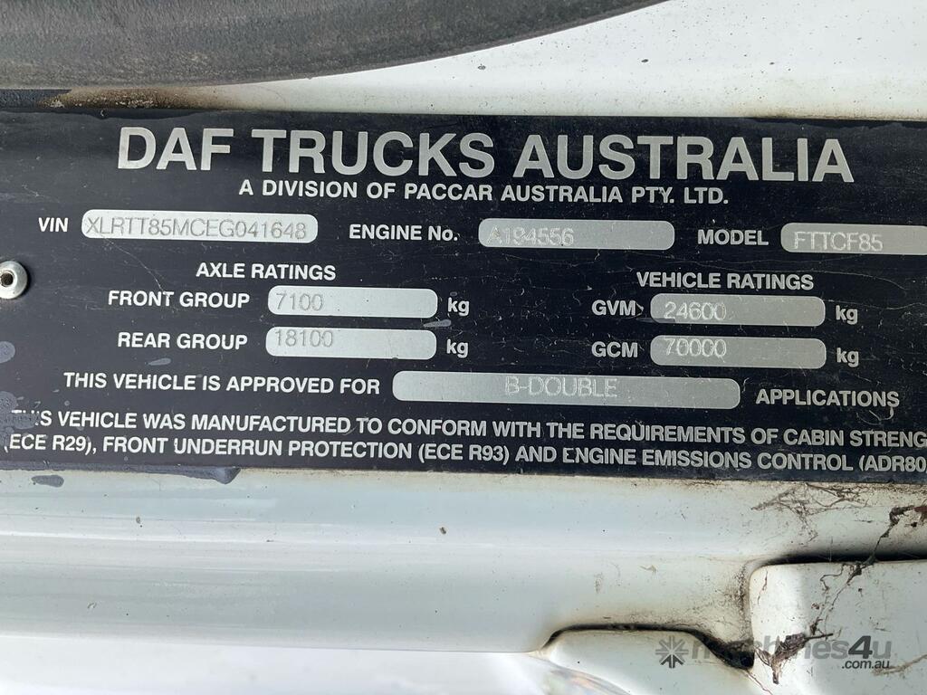 CP: 08/2015,DAF,CF 85 460,Tipper,Automatic,Airbag Suspension,392919 (Kms. Showing on Odometer),Hourmeter not visible,Rego. No: NP(1FE6NP), Unregistered,VIN: XLRTT85MCEG041648,GVM: 24600,GCM: 70000,Sold with No Plates