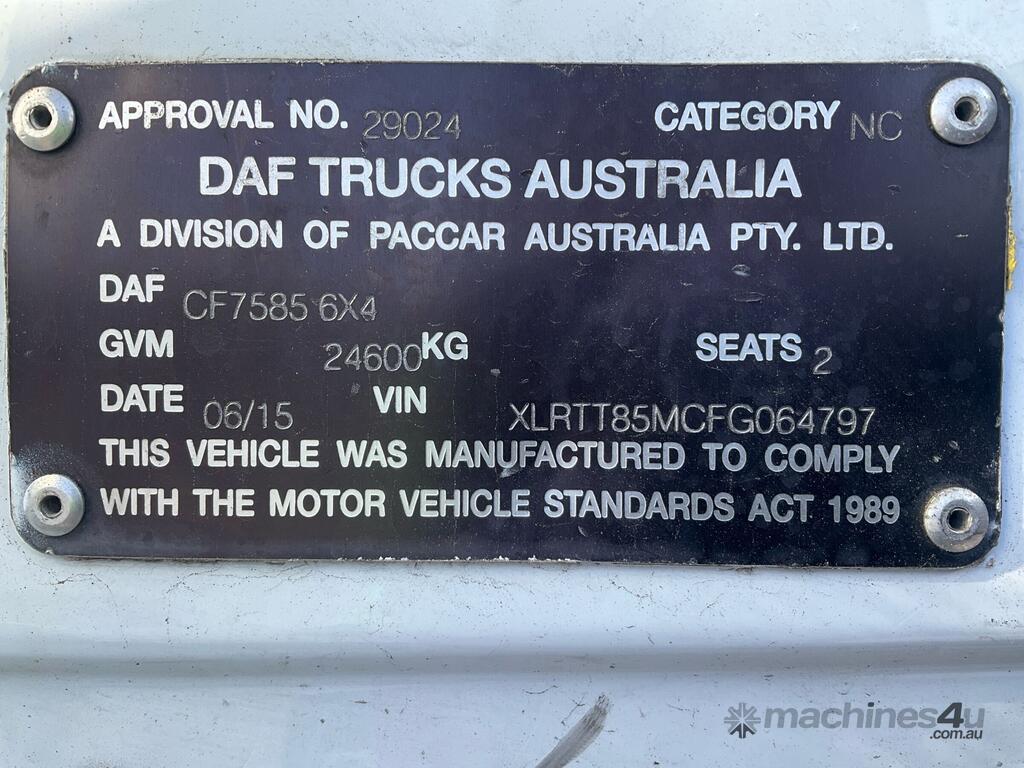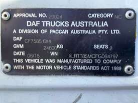 CP: 06/2015,DAF,CF7585,Prime Mover Sleeper Cab,Automatic,8 x Airbags ,Engine #: A213416,Paccar,6 Cyl,Diesel Turbo,1084551 (Kms. Showing on Odometer),Hourmeter not visible,Colour: White,Unregistered,VIN: XLRTT85MCFG064797,Key No: 274E,Length: 6.7 m,GVM: 24600,GCM: 70000,Sold with No Plates,Key No: 274E