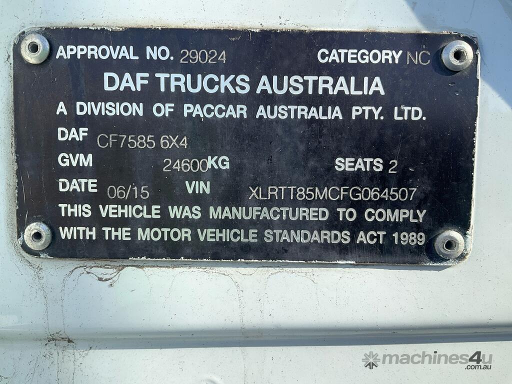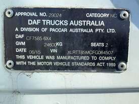 CP: 06/2015,DAF,CF85.460,Prime Mover Sleeper Cab,Automatic,8 x Airbags ,Engine #: A213172,Paccar,6 Cyl,Diesel Turbo,1137585 (Kms. Showing on Odometer),Hourmeter not visible,Colour: White,Unregistered,VIN: XLRTT85MCFG064507,Key No: 314E,Length: 6.7 m,GVM: 24600,GCM: 70000,Sold with No Plates,Key No: 314E