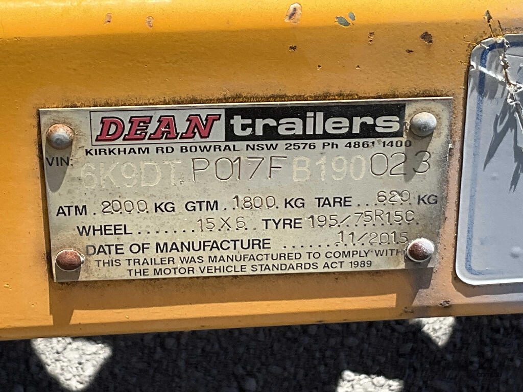 CP: CIRCA 2015,Dean Trailers,Single Axle Trailer,Hubometer not visible,Colour: Yellow,Rego. No: TA17XT NSW,Rego expiry: 06/02/2026,VIN: 6K9DTP017FB190023,Sold with No Plates