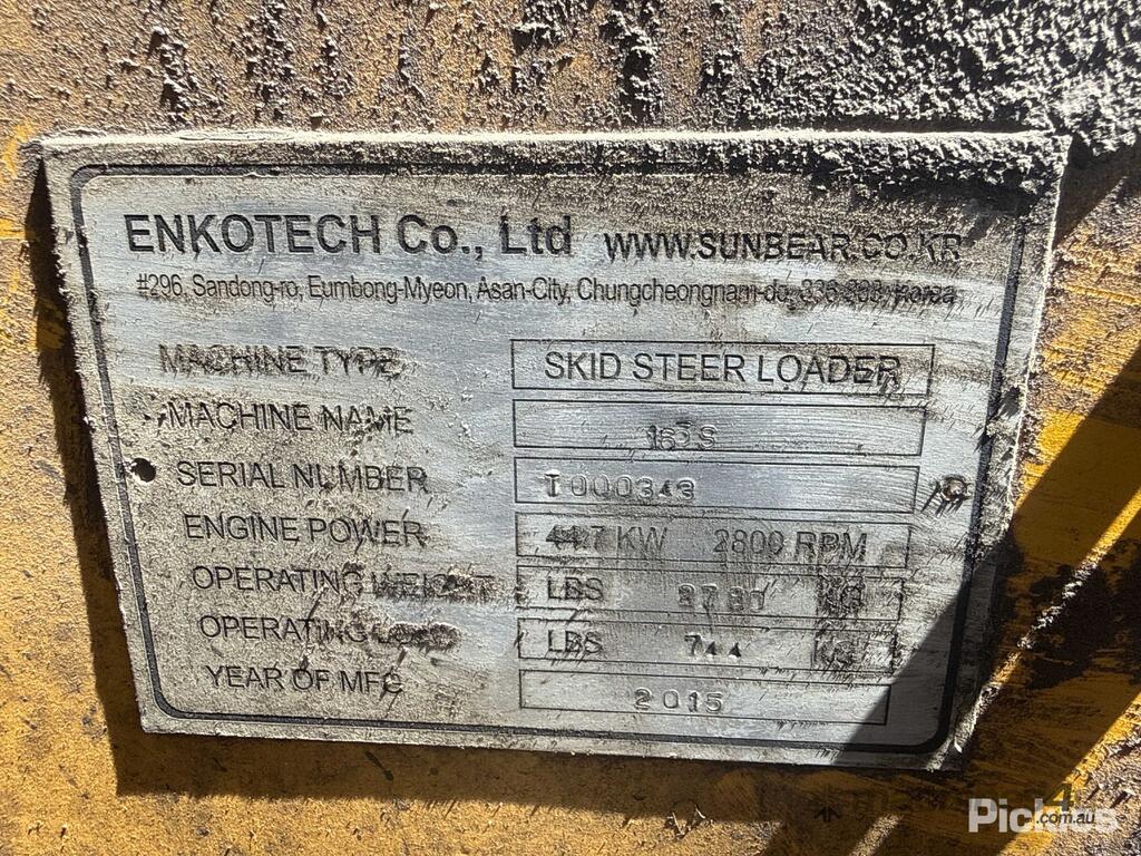 CP: CIRCA 2015,Built: 01/2015,Enkotech,165S,Wheeled Skid Steer,4 Cyl,Diesel Turbo,Odometer not visible,1477 (Hrs. Showing on Hour meter),Colour: Yellow,Unregistered,Serial No: T000343,ROPS No: undefined,Sold with No Plates