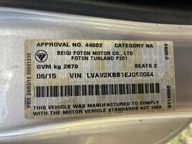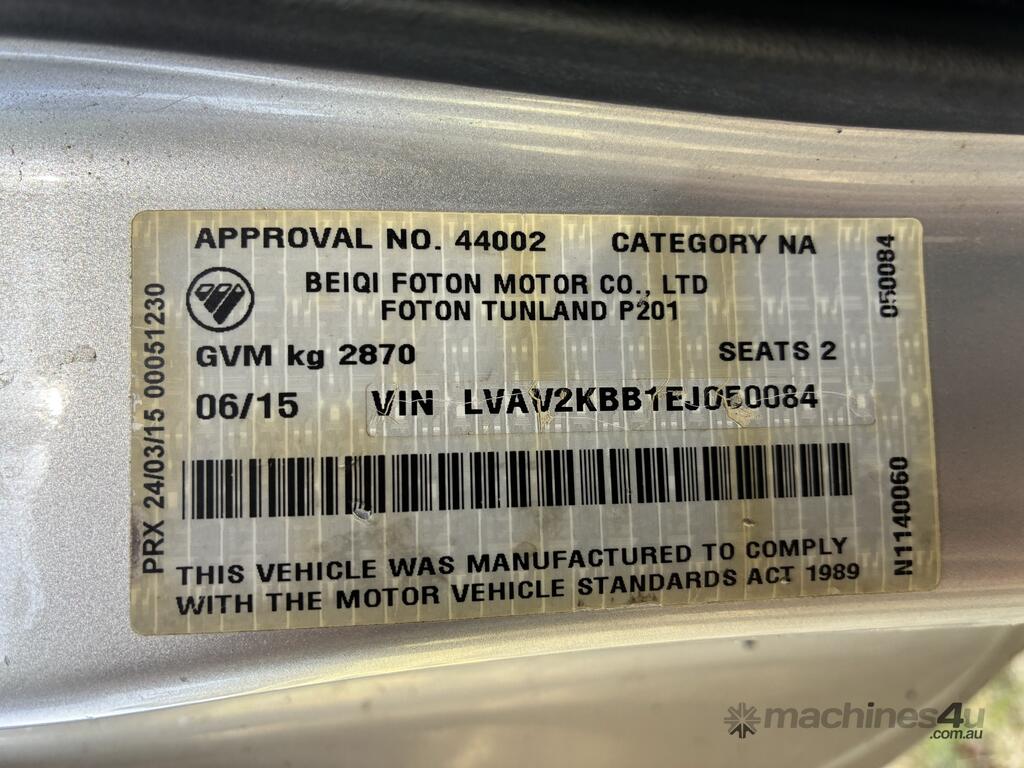 CP: 06/2015,Built: 06/2015,Foton,Tunland,P201,Cab Chassis Single Cab,2 seats,2 doors,Manual,Engine #: ISF28S4129P89646371,2.8 Ltr,4 Cyl,Diesel,Direct Injection,5 Gears,Odometer not visible,Colour: Silver,Rego. No: NP(1HV6UZ), Unregistered VIC,VIN: LVAV2KBB1EJ050084,Sold with No Plates