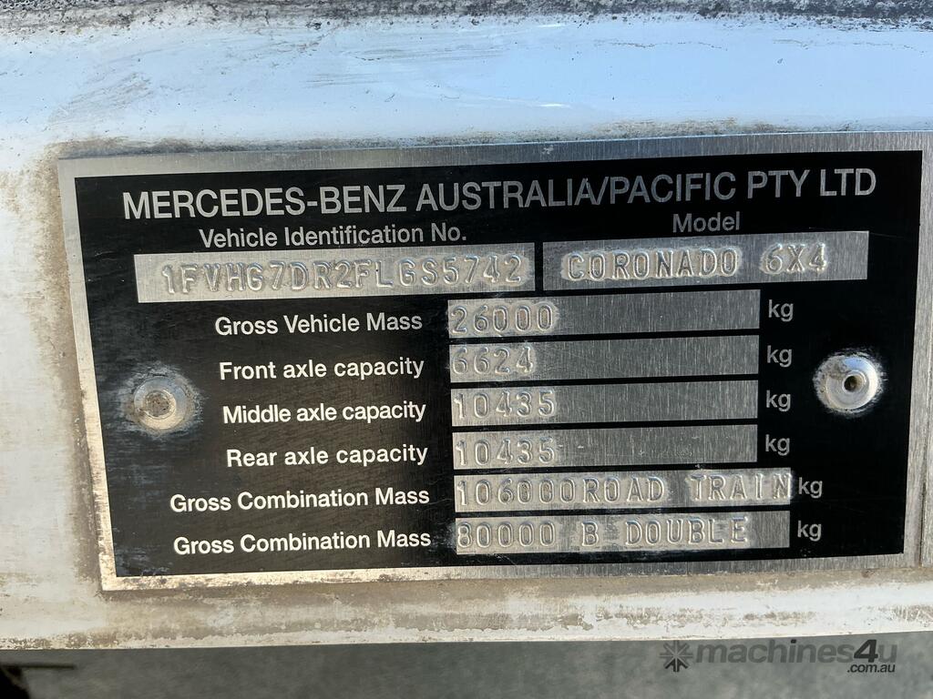 CP: 08/2015,Freightliner,FLX Coronado,Tipper,Manual,Airbags ,Engine #: 472907S01637,DD15,6 Cyl,Diesel Turbo,18 Gears,781694 (Kms. Showing on Odometer),20530 (Hrs. Showing on Hour meter),Colour: White,Unregistered,VIN: 1FVHG7DR2FLGS5742,Key No: 215S,Length: 7.9 m,GVM: 26000,GCM: 106000,Sold with No Plates,Key No: 215S