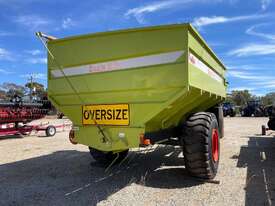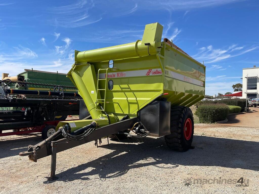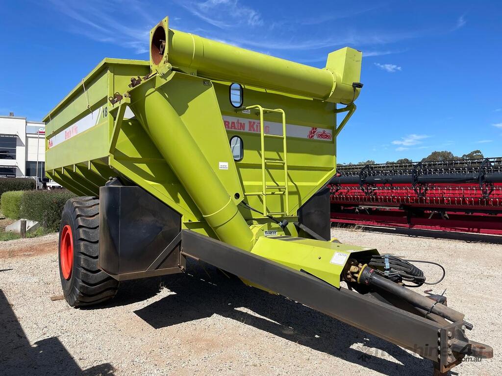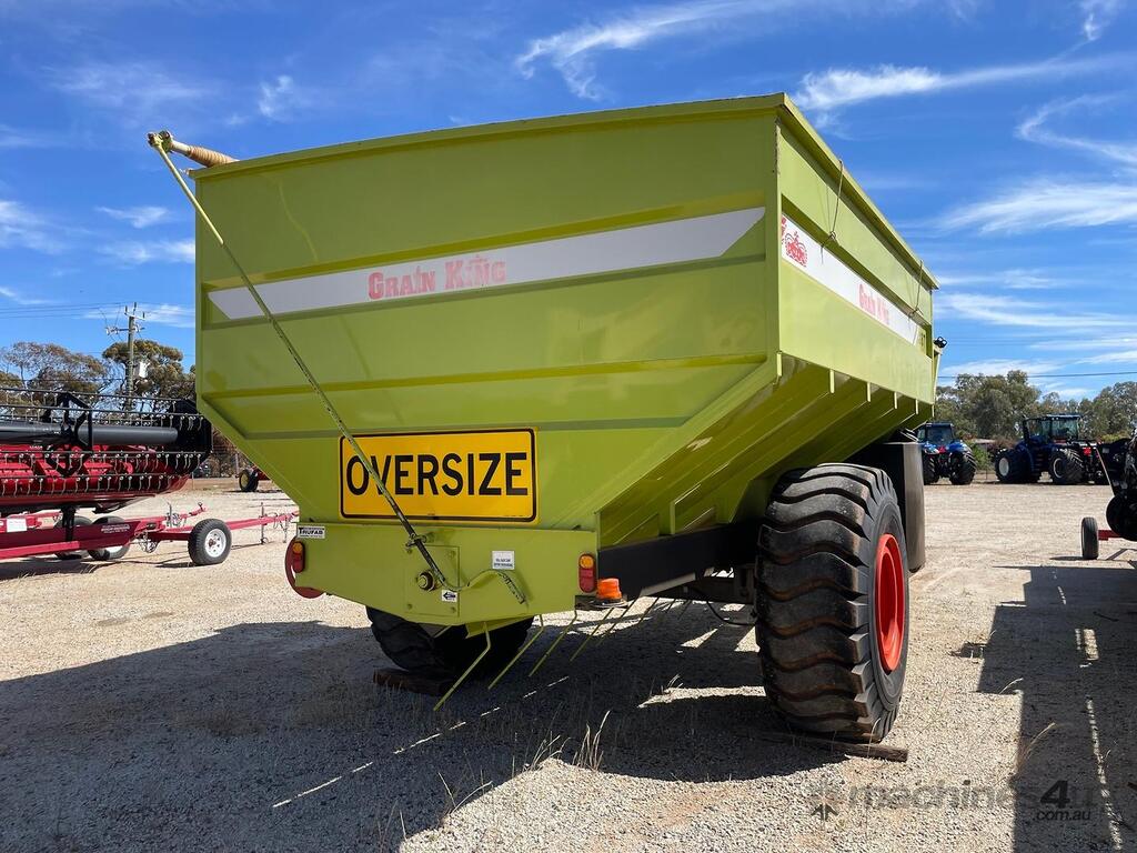 Grain King Chaser Bin. 18 tonne capacity. Single axle with 23.5-25 earthmoving tyres and hydraulic brakes. Fire fighter with hydraulic-driven pump, hose reel, and 2 x 400 litre poly water tanks. 540 PTO driven 14" unload auger, and sweep auger. Road light kit, amber beacon, 'Oversize' sign. Roll tarp.