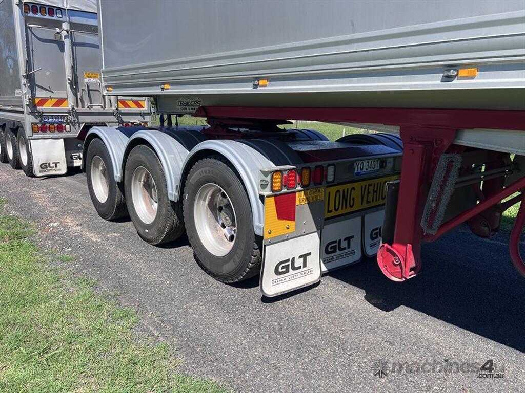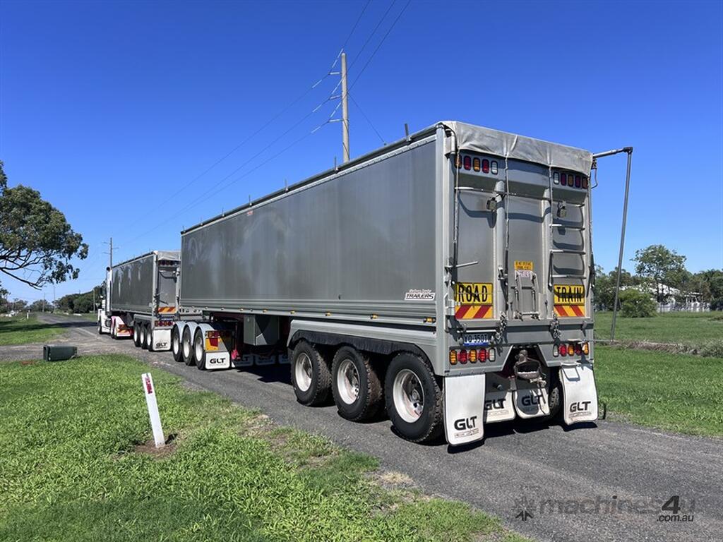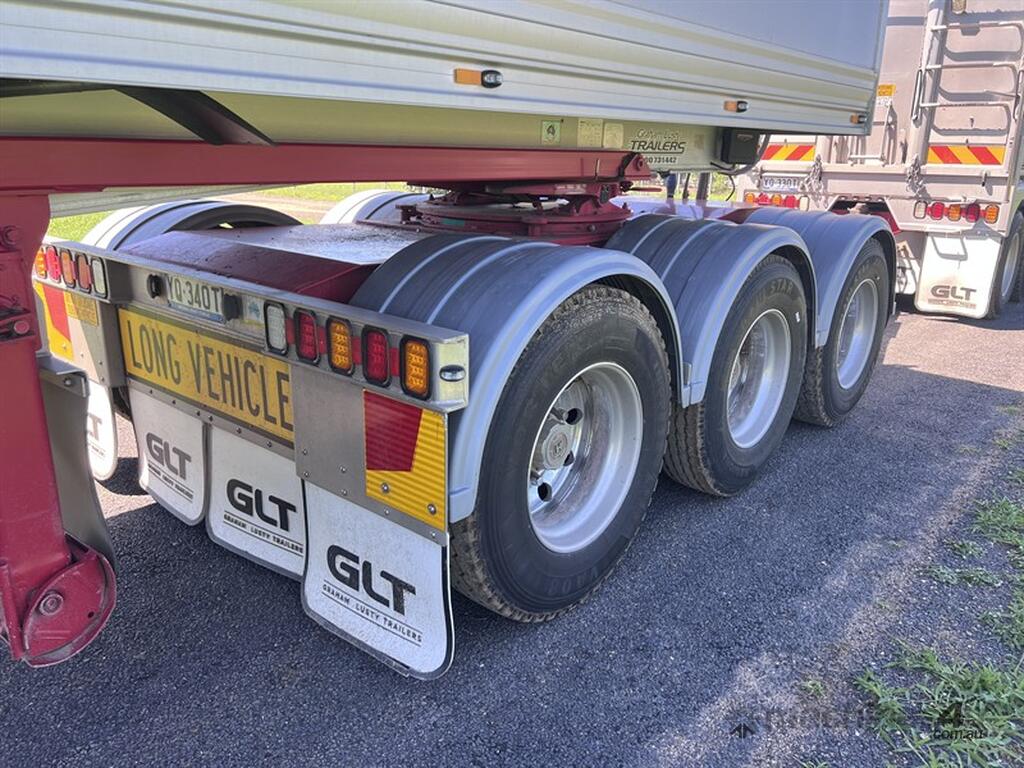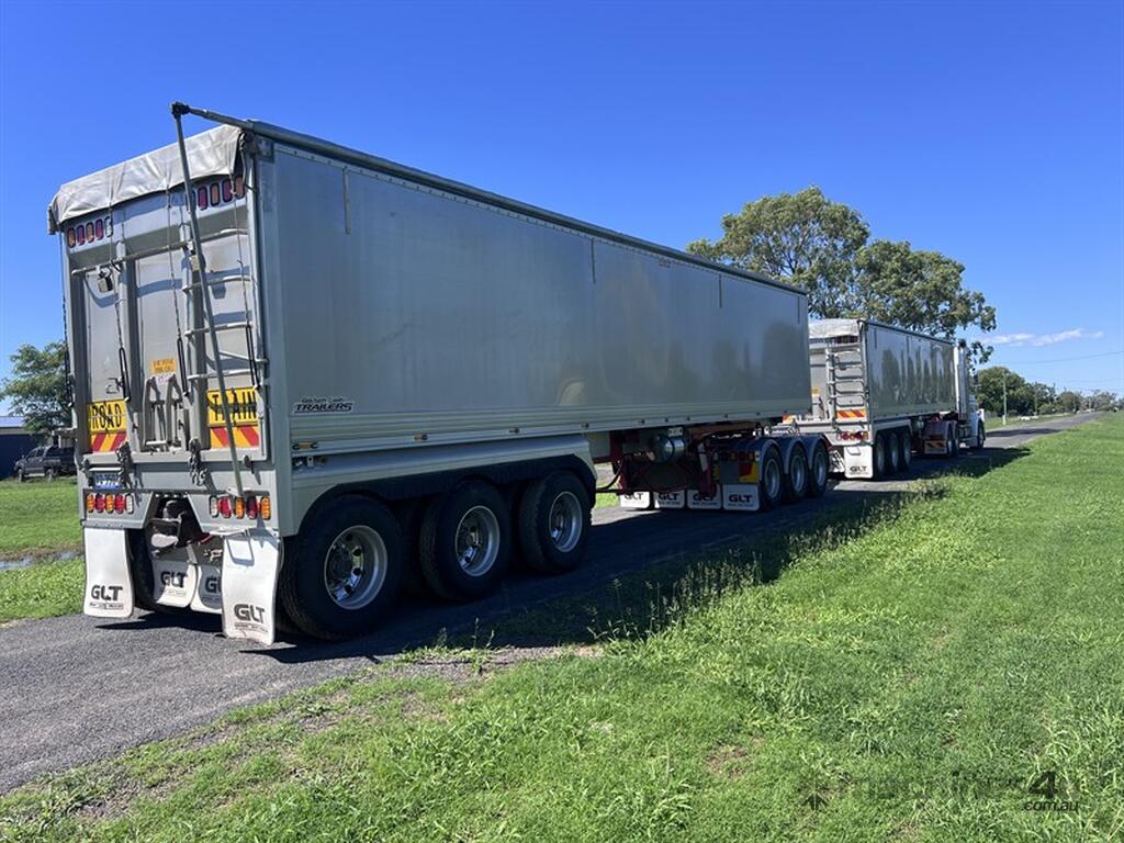 2015 Graham Lusty Trailers Road Train Tippers. 36 foot x 7.2 foot lead trailer, 38 foot x 7.2 foot rear trailer. approx 80% tyres all round, new tarps, just past pit inspection with no issues, airbag suspension, suspension rebushed, wheel alignment both trailers and Dolly. Right Weigh load scales. 2015 GLT Tri-axle Dolly. on trailers, air guage on dolly. Located at Ashley NSW, available at MRE Auctions online sale.