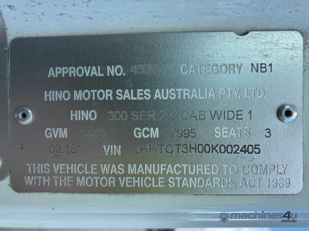 CP: 02/2015,Hino,300 617,Service Body,Manual,Spring,4 Cyl,Diesel,6 Gears,250063 (Kms. Showing on Odometer),Hourmeter not visible,Colour: White,Rego. No: XO54YS QLD,VIN: JHHTCT3H00K002405,Key No: 406,GVM: 5500,GCM: 7995,Sold with No Plates,Key No: 406