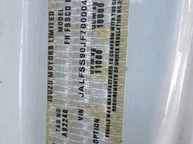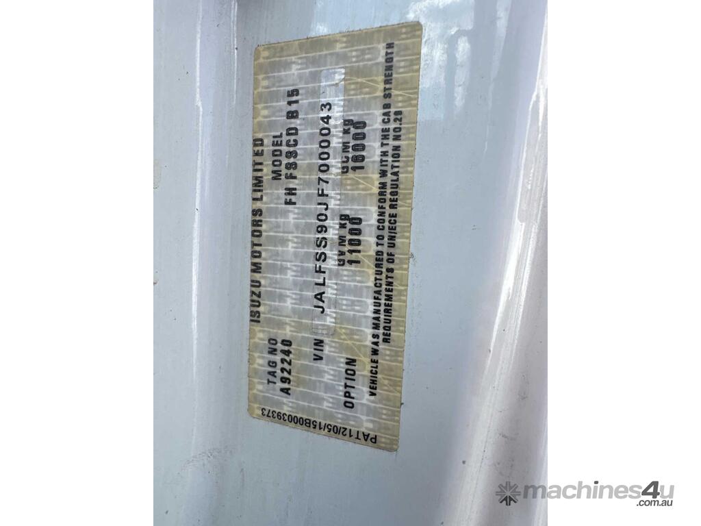 CP: 09/2015,Isuzu,FSS600,EWP,Manual,spring,4 Cyl,Diesel,Odometer not visible,Hourmeter not visible,Colour: White,Rego. No: NP(960VYY), Unregistered QLD,VIN: JALFSS90JF7000043,Length: 7 m,GVM: 11000,GCM: 16000,Sold with No Plates