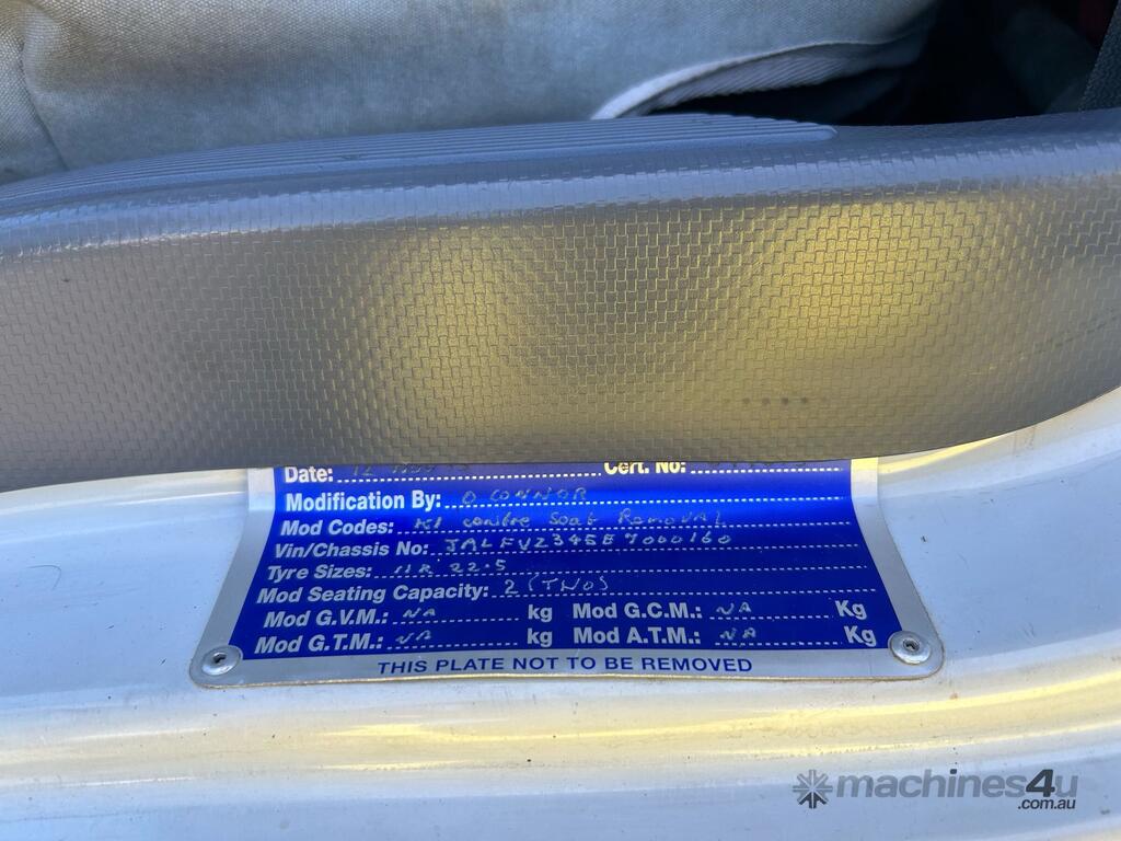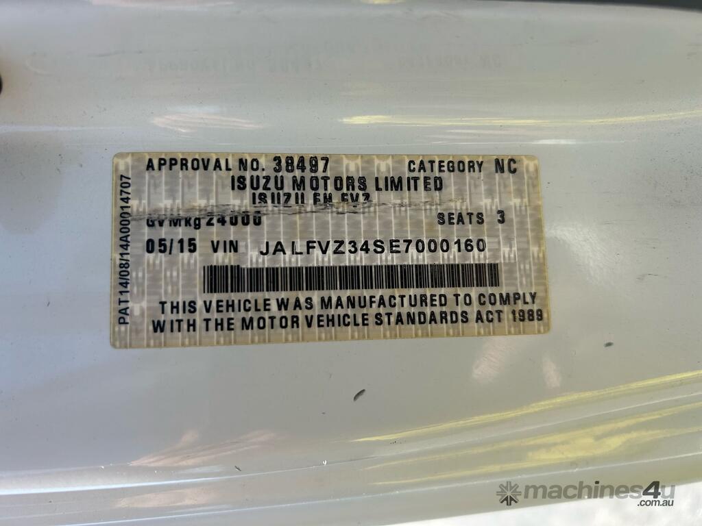 CP: 05/2015,Isuzu,FVZ 1400,EWP,Automatic,Spring,6 Cyl,Diesel,105802 (Kms. Showing on Odometer),10483 (Hrs. Showing on Hour meter),Colour: White,Unregistered,VIN: JALFVZ34SE7000160,Key No: 119,GVM: 24000,GCM: 36000,Sold with No Plates,Key No: 119